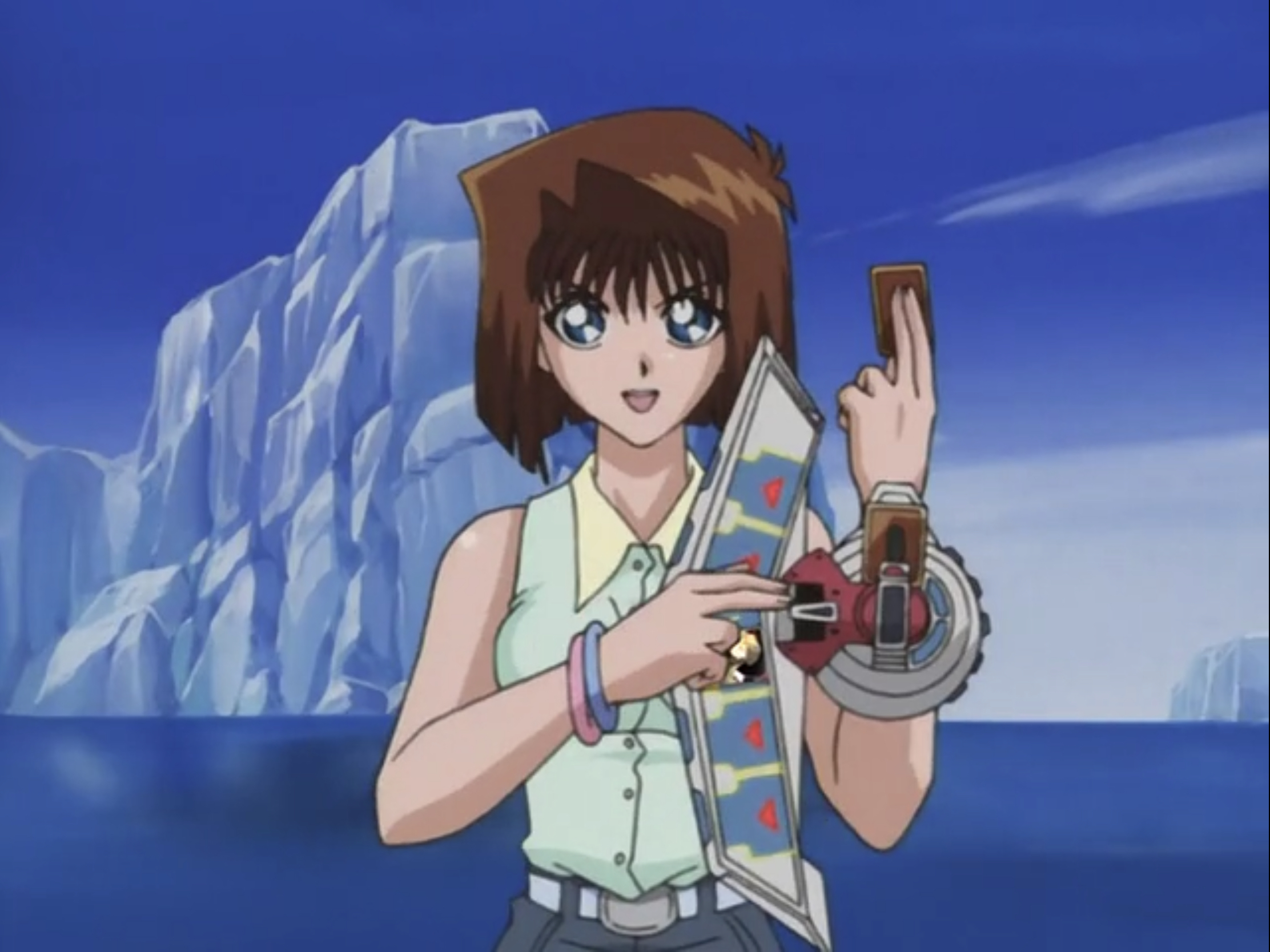 Miho’s role in the story was greatly expanded for the Toei anime, where she was voiced by Yukana Nogami. Here, she is on the main group of Yugi’s friends, and come across as a shallow, somewhat air-headed girl, who nonetheless cares deeply about her friends, and is not afraid to confront people who endanger them. She exploits Honda’s crush to get gifts from him, but she ultimately falls for Ryo Bakura. Miho is not part of the “jigsaw puzzle love note” storyline, which is redone to focus on Jonouchi and a girl named Mayumi, but Honda still has a crush on her. Miho was name-checked in episode 168 of Yu-Gi-Oh! GX, where her name appears on the top of a list that Axel Brodie was looking at.